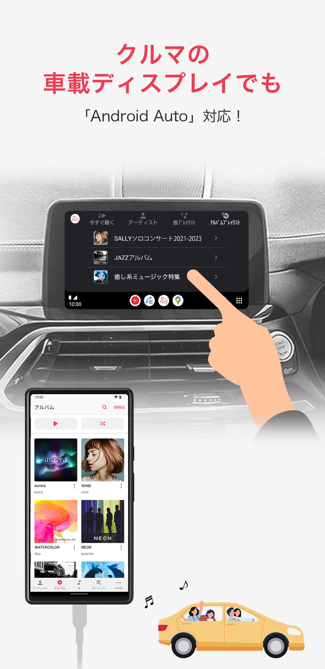 さらに、Android Autoに対応しているため、スマホを車載ディスプレイに接続すれば、取り込んだ楽曲を簡単に選択し、車内での音楽再生をより快適に行うことができます。大画面で直感的な操作が可能となり、安全かつ便利に音楽を楽しめます。